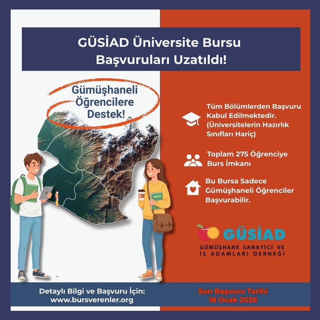 GÜSİAD olarak her yıl düzenli olarak verdiğimiz burslarla ilgili duyuruları yapmıştık, ancak planladığımız 275 adet burstan yayınladığımız esaslara göre kabulü yapılanların sayısının beklediğimiz adetlerde olmadığı görülmüştür. Bu sebeple bazı öğrencilerin müracaat takvimini kaçırdığını düşünerek, burs şartlarının kapsamını biraz da genişleterek yeni düzenlemelerle müracaat süresini 18 Ocak 2026 tarihine kadar uzatıp, sizleri yeniden bilgilendirmek istedik. Bildiğiniz üzere Burslar kendisi, anne veya babası Gümüşhane’li olan öğrencilere verilecektir. Bu doğrultuda yenilenen burs kriterleri aşağıdaki gibidir: